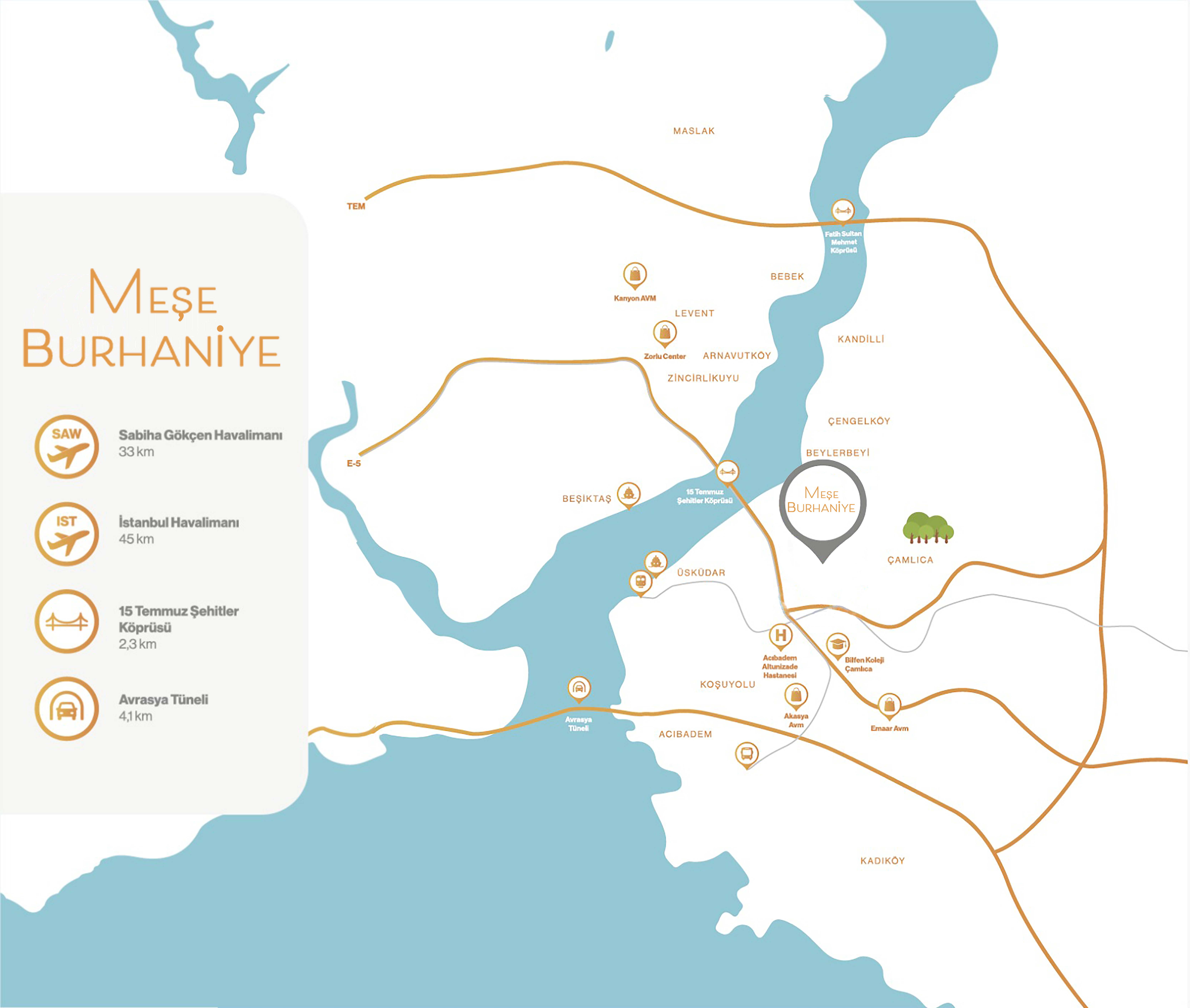 Zengin ulaşım çeşitliliğiyle öne çıkan bölge, İstanbul’un tüm ayrıcalıklarının kıyısında bulunuyor. Bu sayede hayatın tüm güzelliklerini size sunarken, şehrin en önemli noktalarına sadece dakikalar içerisinde, kolayca ulaşabilmenizi sağlıyor.